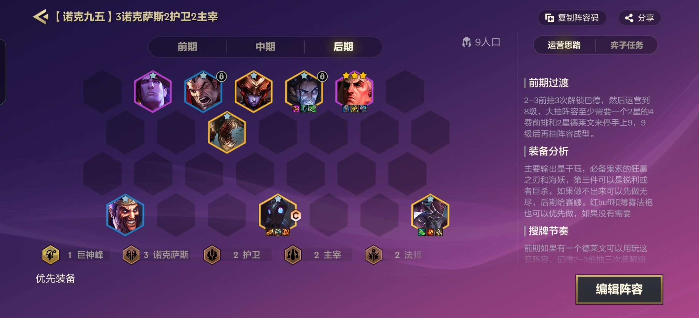 起手德莱文诺克九五,以绪塔尔就岩宝上八d塞拉斯,没血可以400层提前收菜重新叠100层,累计500层解锁岩宝,最好是625层收菜,常用是艾欧转95,瘸子和肾前期真的很强,蛮王同行多就转95,比尔别碰,大赛压力大打不过人。 起手D巴德留皇子,2阶段上一些2星,尽量别输,3-4阶段掉血猛也别慌,存巴德的刷新,上八就D4费2星加挂一些5费,光辉和盖伦2星就卖,解锁塞拉斯上9,这样小95就可以锁血上9了