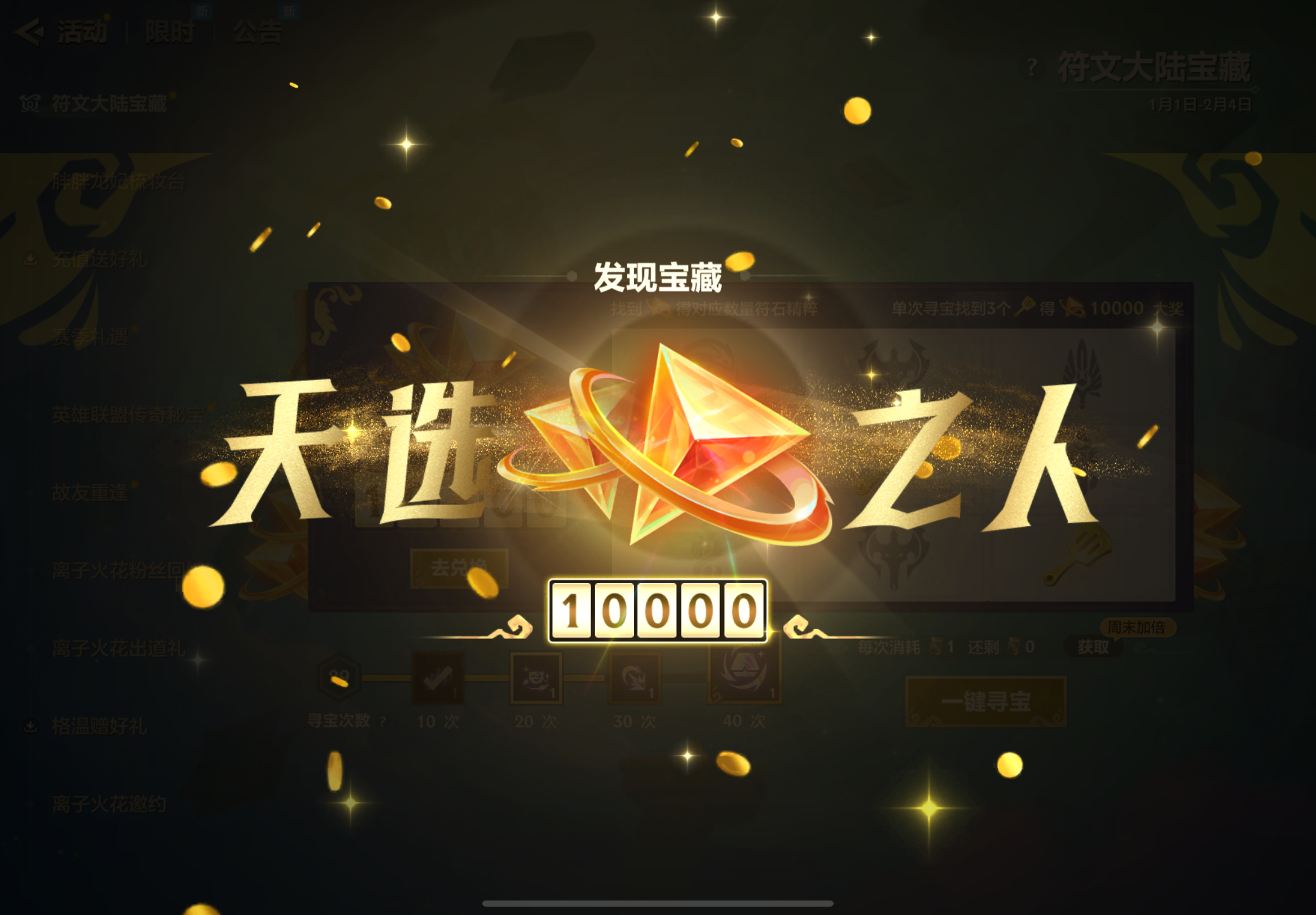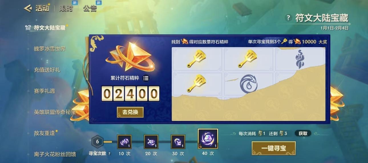 金铲铲相比大家是不陌生了,但是!今天俺刷出来了三个金铲铲!10000符文精粹!是谁还没刷出来!想问大家都换哪个竞技场呀?一、活动时间1月1日10点起。二、参与方式每日登录游戏或参与对局,即可获取寻宝次数(活动期间最高可获 110 次)。三、寻宝规则单次寻宝:找到符石精粹图标,直接领取对应数量奖励;彩蛋奖励:单次寻宝集齐 3 个金铲铲,解锁 10000 符石精粹;累计上限:活动期间累