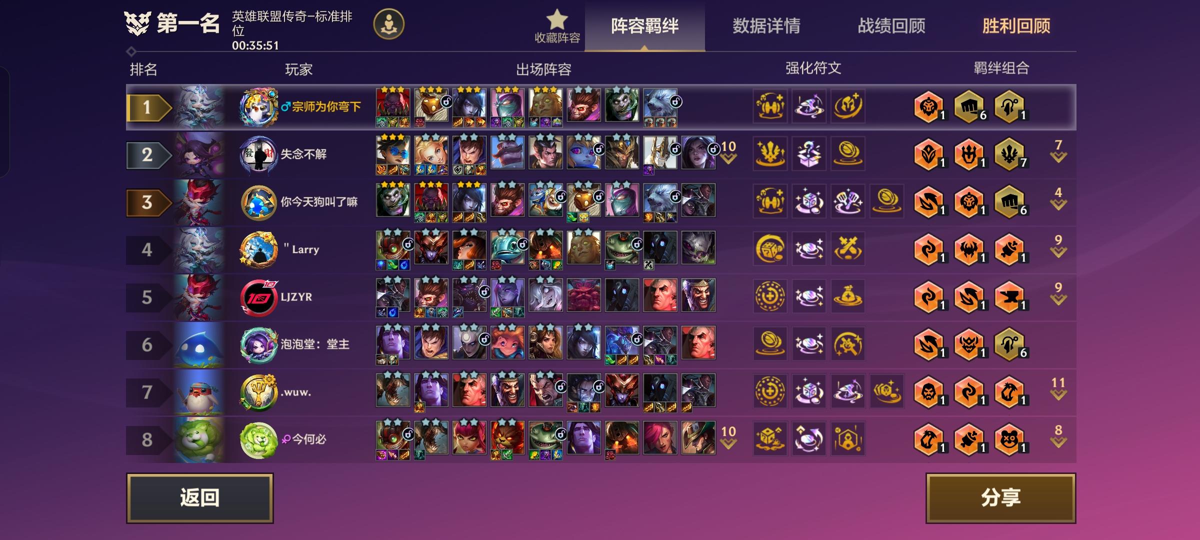 要不是第三个海克斯给我来大棒溢流,四家约德尔凑不出一张小法。提莫伤害真高啊,一星小法还没有三星提莫伤害高,而且提莫还能时不时打一下后排,配合小鱼人过渡很舒服。升四星后排要占5个格子,我玩约很缺格子所以提莫只有三星,这个第五玩巴斗的,值得等待塞恩天胡,竟然也没有四星。本来我3-1才开出4约,以为这把没了,没想到坚持下去竟然吃鸡了。
