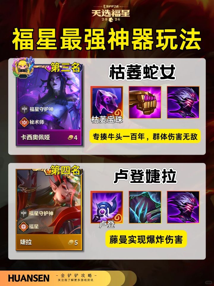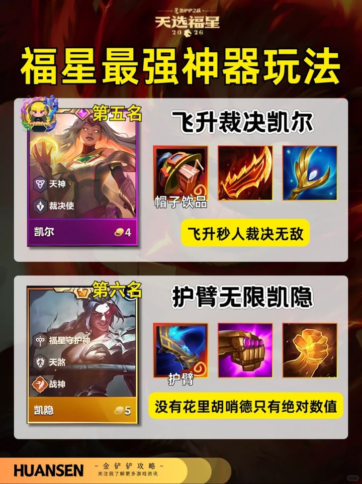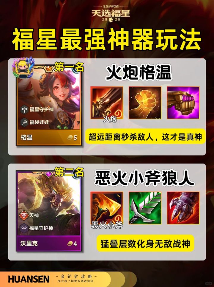 内容转自:HUANSEN金铲铲攻略火炮格温超远秒人,恶火狼人叠层无敌,枯萎蛇女专揍牛头,黎明千珏藤曼炸伤害,护臂凯隐数值碾压,飞升凯尔裁决秒人