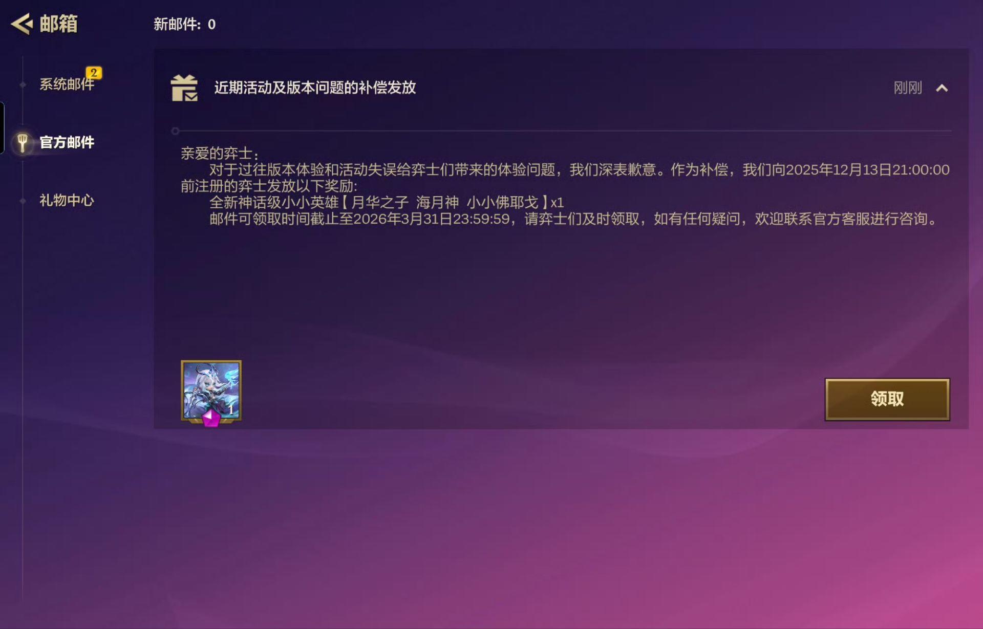 2026年1月1日更新后,《金铲铲之战》官方针对此前“不朽传奇召唤”活动规则失误事件,向符合条件的玩家正式发放补偿限定神话级小小英雄“月华之子 海月神 小小佛耶戈”。领取条件仅限2025年12月13日21:00前注册的玩家,全服符合资格的弈士均可参与领取。发放与领取规则方面,补偿通过游戏内邮件陆续发放,到账时间存在先后差异,玩家需在2026年3月31日23:59前完成领取,逾期邮件将失效。补偿物