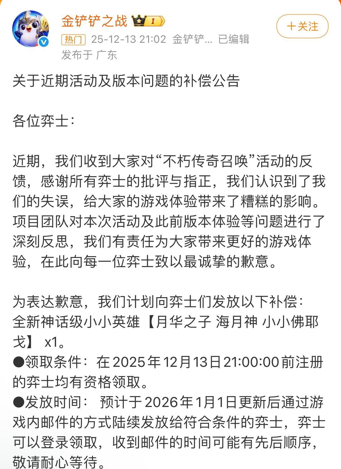 2026年1月1日起,《金铲铲之战》全服补偿已陆续发放至玩家邮箱,全新限定神话级小小英雄【月华之子 海月神 小小佛耶戈】开启免费领取通道,引发玩家热议。此次补偿源于2025年12月12日“不朽传奇召唤”活动的规则设计失误,活动上线3小时内,471名玩家发现漏洞,仅需60元即可抽取神话/至臻道具,6000元便能解锁原价10万元的全图鉴奖励,官方紧急下架后宣布不予回档,引发广泛争议。为平息风波,官