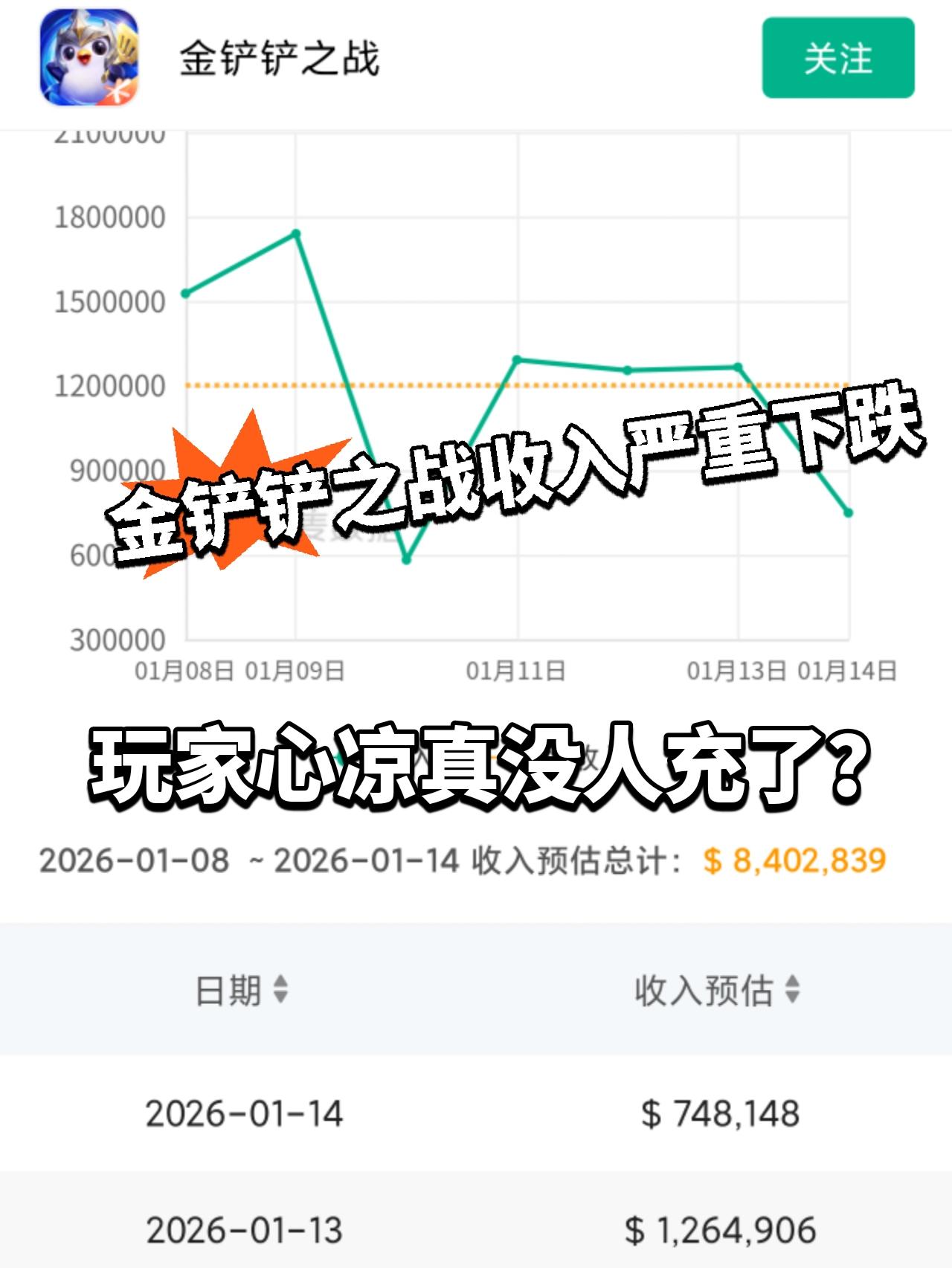 大的来了家人们!金铲铲之战收入跌得也太狠了,相关数据一公布 大伙都在热议,是不是真没人愿意充💰了! 1月13号这天收入还有126万多,结果1月14号直接跌到74万多,一天时间就少了一半多,落差大得让人意外。再看上周总收入,也才840万左右,整体收入看着就很不景气。 有人说现在游戏里没啥新皮肤、新活动,没啥值得花钱的地方,自然没人愿意充。 还有人吐槽版本不行,阵容不平衡,玩着没以前有意思,连