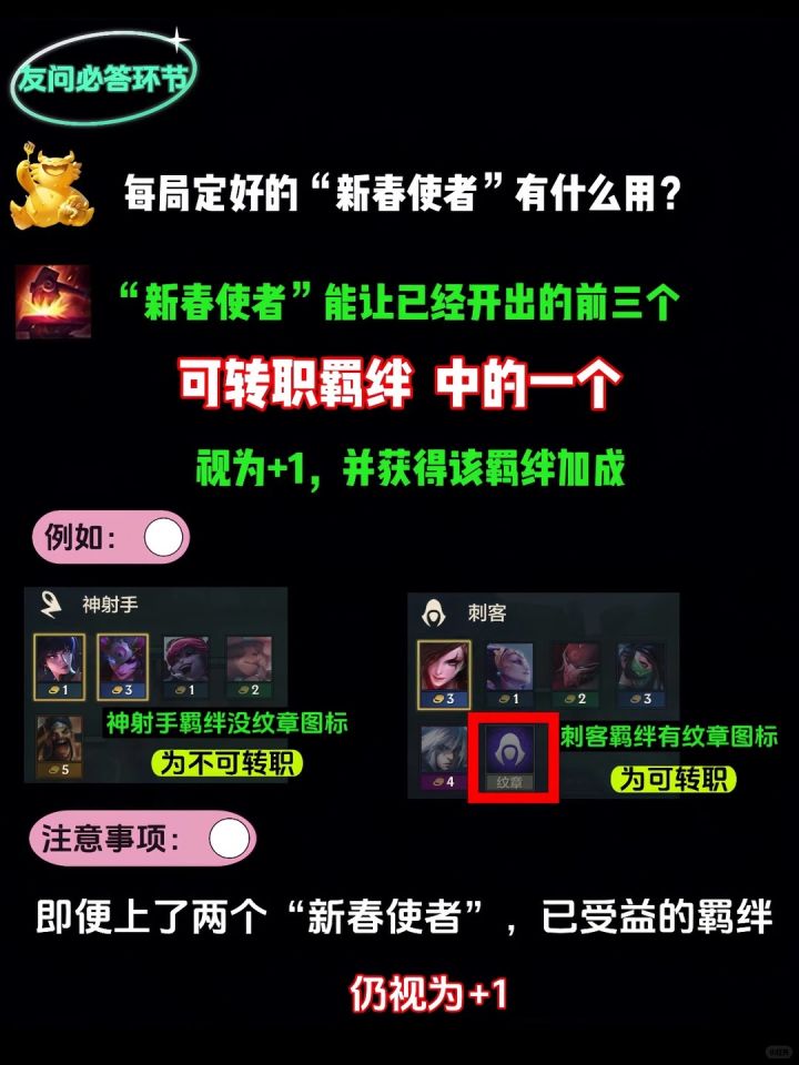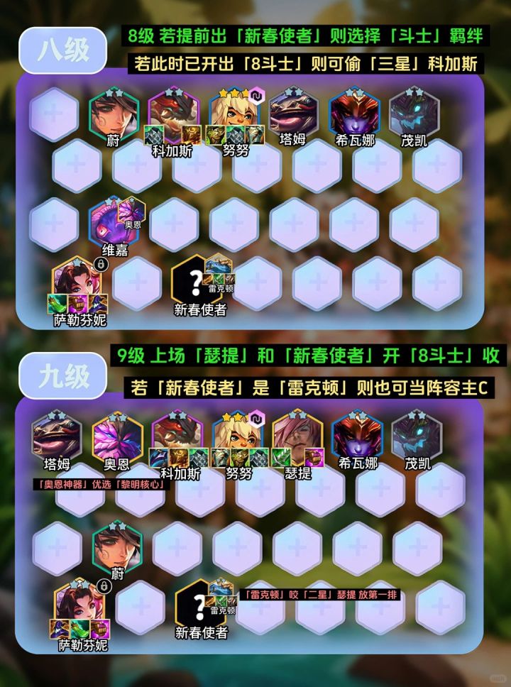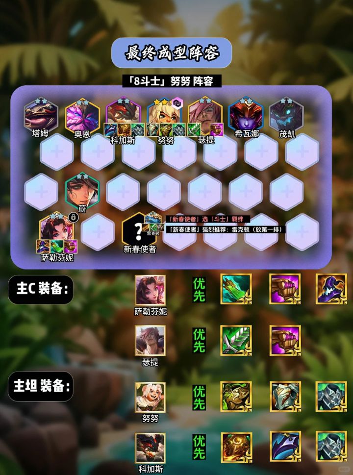 内容转自:金铲铲羊小刀这套阵容不用看【天选】标记的羁绊,只用找到【天选】努努,随后「新春使者」选「斗士」羁绊即可(如P3所示)随后7级一名弈子的法强到达100可以解锁「萨勒芬妮」(以正式服上线为准)【运营思路】2阶段开「2斗士」x「3永恒之森」过渡升级节奏:2-1升4级;2-5升5级选秀抢「腰带」优先合成「努努」的装备若提前出「努努」或「希瓦娜」则优先开「4斗士」6~7级 可以找「