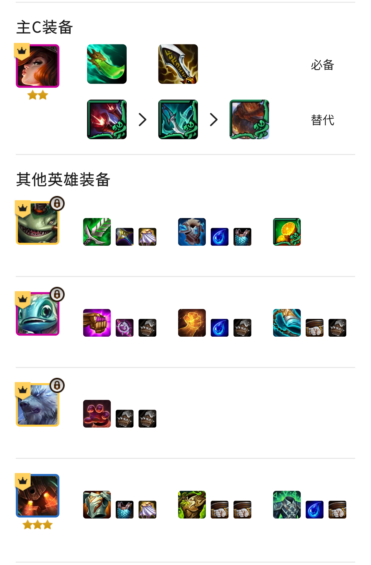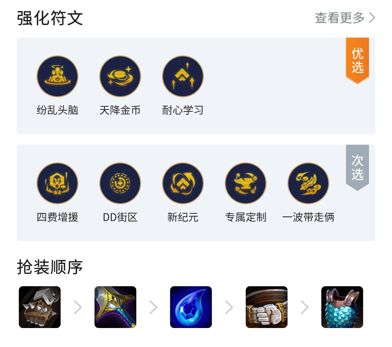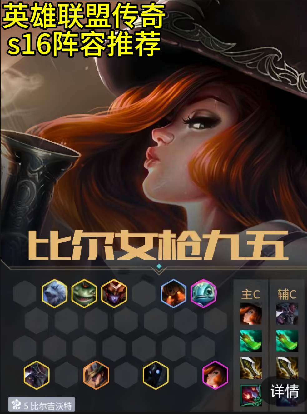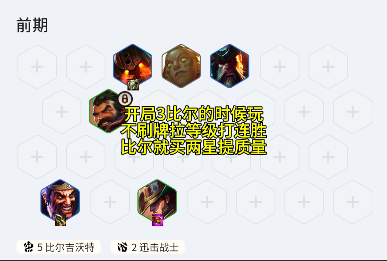 前期过度推荐开局给卡牌或者3比尔的时候考虑玩,开3比尔加斗士过度, 比尔商店前期买两星打工,泰坦可以追三,其他的留着7比尔买神器,燧发枪>短剑>酿造品>酒吧/柑橘 装备分析女枪:青龙刀+无尽+燧发枪/短剑小鱼:法爆+正义+破防泰坦:板甲+狂徒+振奋/日炎 搜牌节奏推荐开局3比尔起手再玩,前期能连胜最好,装备有就合成打连胜,4-2左右拉8级开7比尔加奥恩/乌鸦/布隆/龙女/蝎子,抽