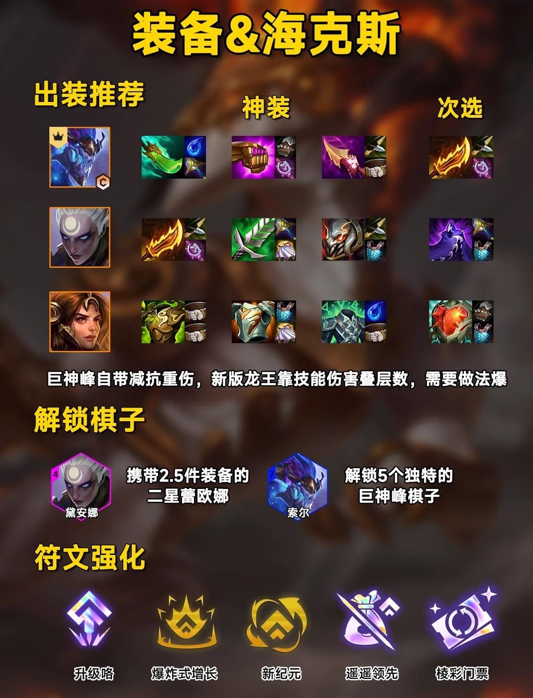 内容转自:金铲铲小福新版的龙王叠层机制变成用技能伤害叠层因此出装上必做启动装和法爆解锁龙王的条件是登场5个不同的巨神峰棋子二星蕾欧娜和一张塔里克是硬性条件①开局有一张蕾欧娜/英勇福袋/星界感召海克斯,此时可直接玩龙王D牌的时候比较容易就能找到二星蕾欧娜星界感召海克斯在3-7直接送一个塔里克(3-2才有机会刷到此海克斯)②开局啥都没有,但我就是想玩一下龙王推荐用斗士巴德那套来过渡,