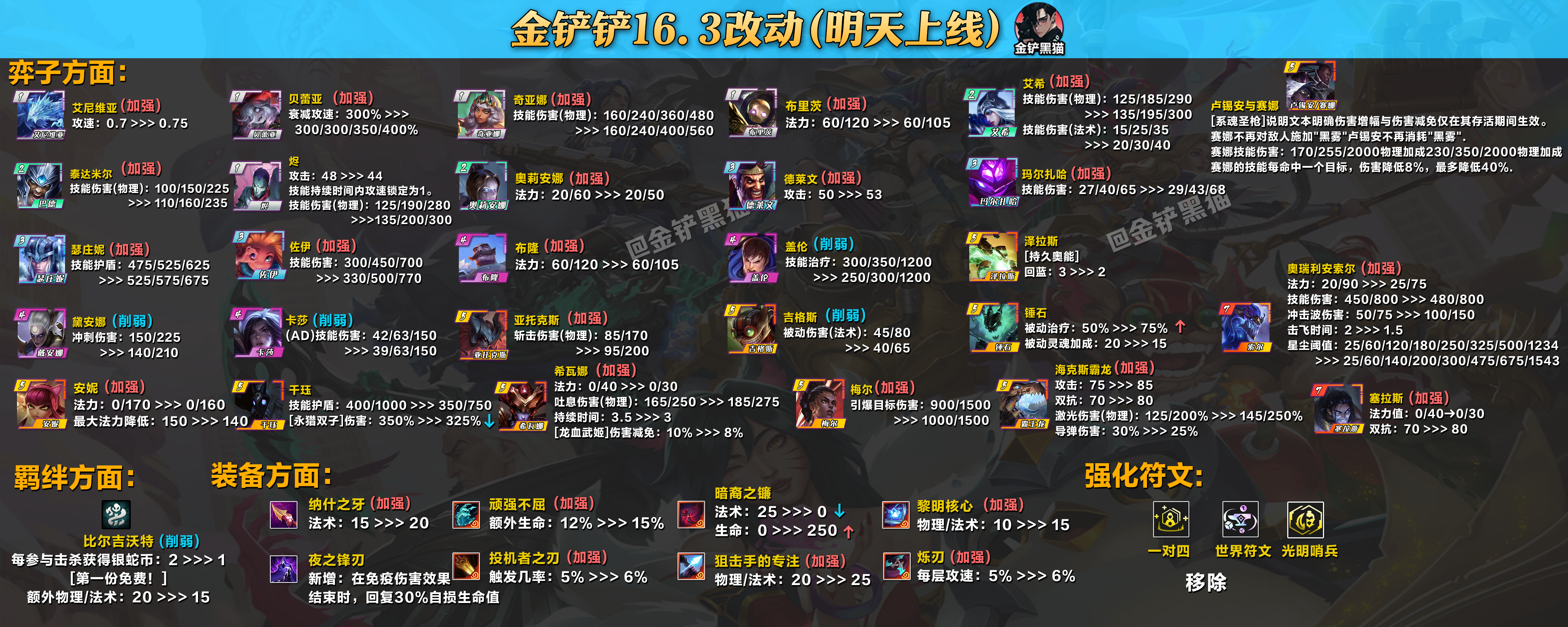 内容转自:金铲黑猫金铲铲将于明天更新16.3版本,本次更新较大,吉格斯/比尔体系将迎来削弱。金克丝、六斗塞恩阵容吃分能力更稳定了,大卑异常攻速被修复了(吃分应该没问题),龙王重做后,巨神峰体系登场率会上升,强度待测试。蛮王和霸王龙之前削的比较惨,即使本次加强后,预计强度还是偏低。