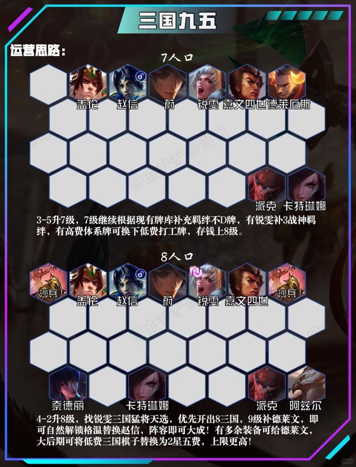 内容转自:金铲铲葡葡萄天选福星现版本最强上分阵容!三国羁绊无论前中后期都能打,满血吃鸡不是梦!搭配战神德莱文,强度非常高,新手也能把把硬玩,把把吃鸡,一定要试试!羁绊构筑:8三国猛将+3战神+2刺客+2神盾使+2神射手(无需任何转职即可达成此羁绊)天选之人:锐雯 三国猛将天选福星守护神:格温,解锁条件:8级+激活5个羁绊,大成即可自然解锁。运营思路:详细的运营见P3-4图解(一定要仔细