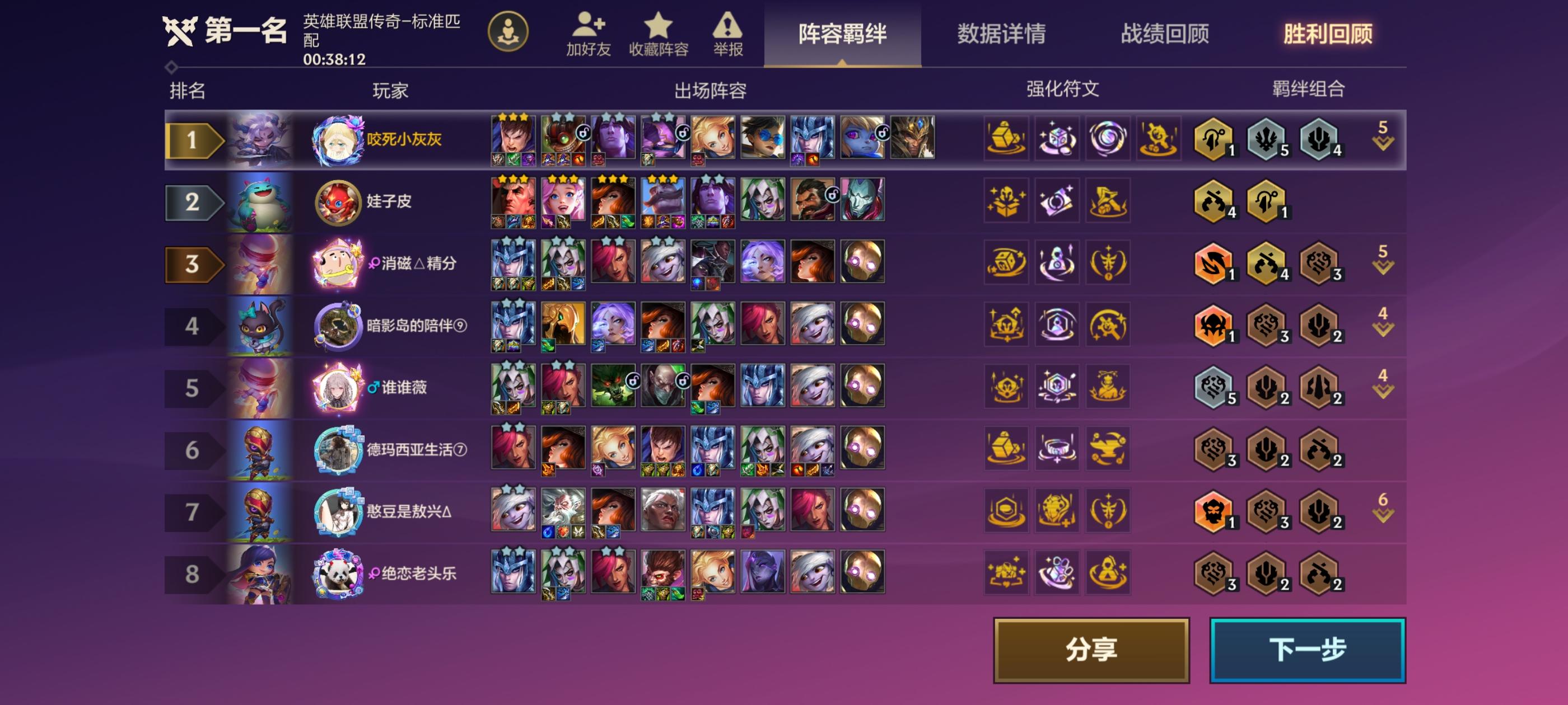 3祖安3德3艾2约2皮城+2斗2护2狙神2神盾最后只是多了一个护卫,少了一个法师究极拼好饭阵容,真的好玩,中间直接一二星的拼好饭阵容连胜上9开了瑞兹可惜最后惜败十比