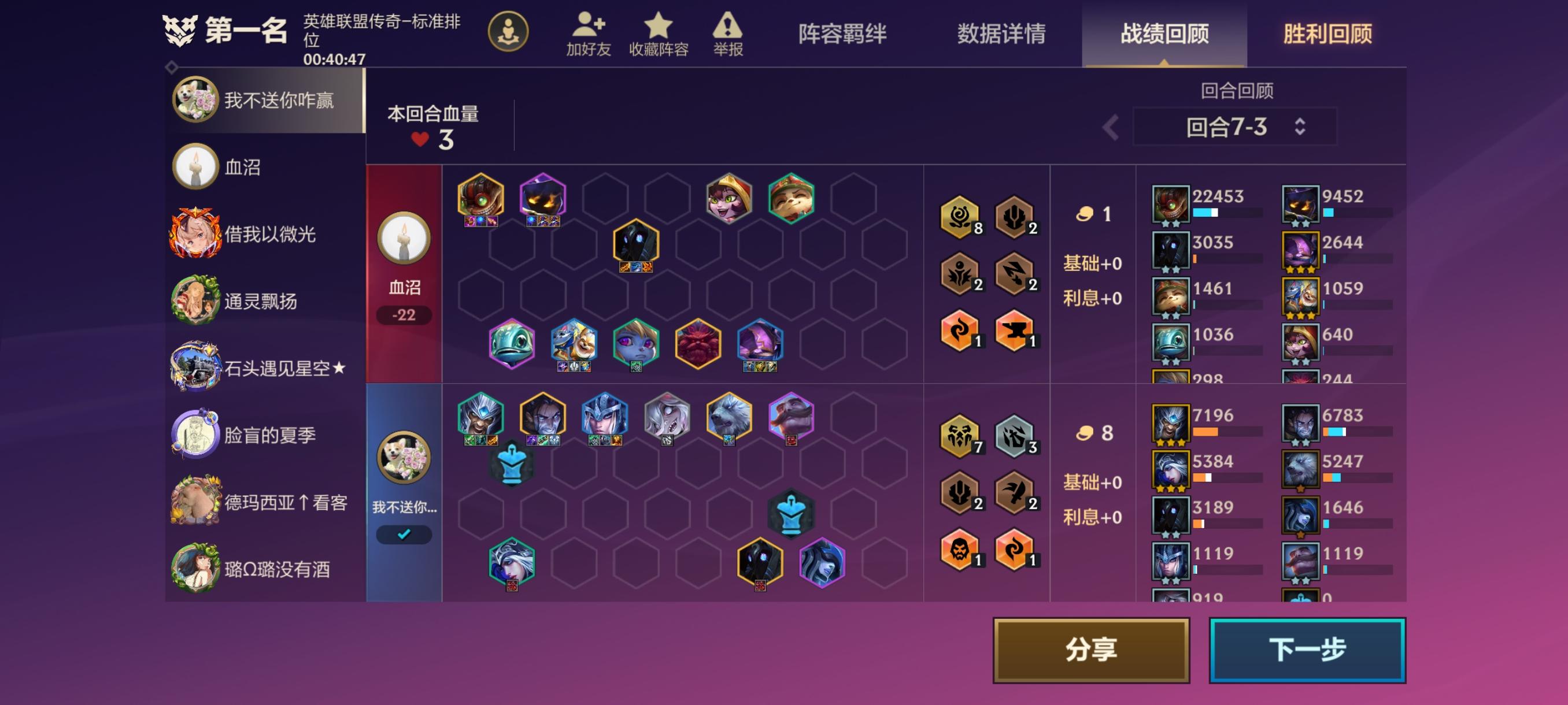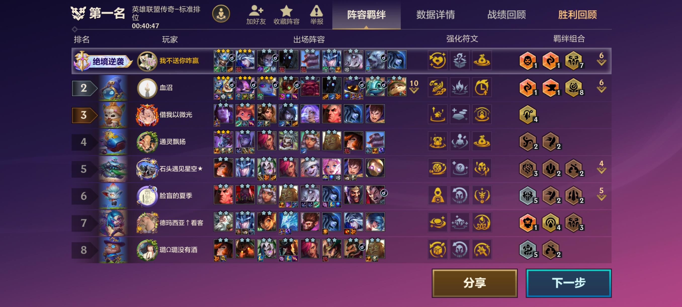 3祖安3德3艾2约2皮城+2斗2护2狙神2神盾最后只是多了一个护卫,少了一个法师究极拼好饭阵容,真的好玩,中间直接一二星的拼好饭阵容连胜上9开了瑞兹可惜最后惜败十比
