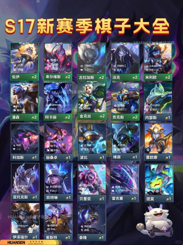 内容转自:HUANSEN金铲铲攻略S17 全部棋子星界爆料棋子,5 费神仙打架:莫甘娜、菲奥娜、烬、娑娜、慎、布里茨、薇古丝、格雷福斯、劫、巴德!4 费核心卡:霞、娜美、卡尔玛、库奇、拉莫斯、乐芙兰、索尔、加里奥、千珏、易大师!新羁绊新玩法,这赛季太顶了