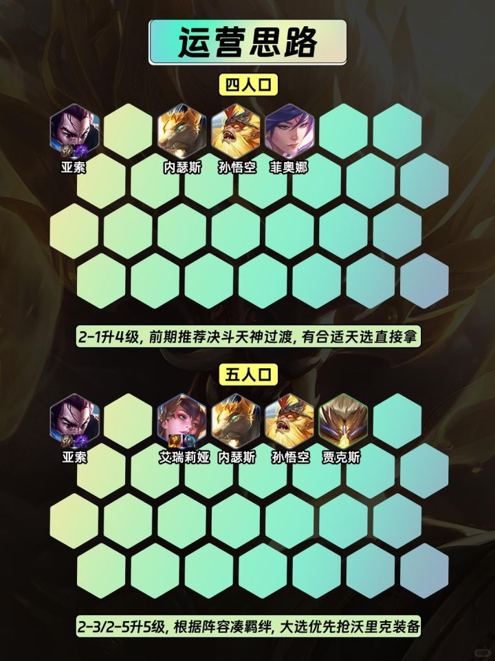 内容转自:金铲铲懒羊羊【运营思路】4⃣2-1升4级,前期推荐决斗天神过渡,有合适天选直接拿5⃣2-3/2-5升5级,根据阵容凑羁绊,大选优先抢沃里克装备6⃣3-2升6级,中期优先开4决斗或者4天神,肉装给二星前排7⃣3-5/4-1升7级,继续补人口凑羁绊,有高费卡替换低费卡8⃣4-1/4-2升8级,先卖低费天选然后大D找凯尔和基础阵容开6天神,沃里克解锁后上场,之后在8级找阵容全员二星