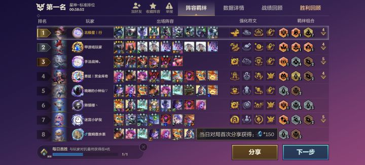 以为会和福星一样凑够条件吃鸡,费力凑齐满级和9暗星羁绊,眼睁睁看着黑洞一点点移动到棋盘中心,到启动前一秒,被对面莫甘娜秒了,这羁绊描述的太霸气,让我一时难以接受,以为稳吃鸡,结果拿个第二