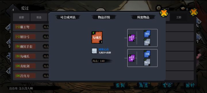 第一次做攻略拳法的我目前用的最多的一套 (装备合成最好背一背 )勾魂爪 , 封天神符 ,将军铠甲, 定魂珠,勾魂爪无视20%的防御 封天神符把40%的伤害转成真实伤害 将军铠甲被攻击低档100伤害 定魂珠无视闪避必定命中(百分百命中)这一套主打输出 当然游戏里还有好多别的装备配合,这个自己琢磨杂货铺大部分东西都能出勾魂爪和封天神符的材料都在杂货铺里,不用换地方了除了手刺去池塘搜 看到布衣和