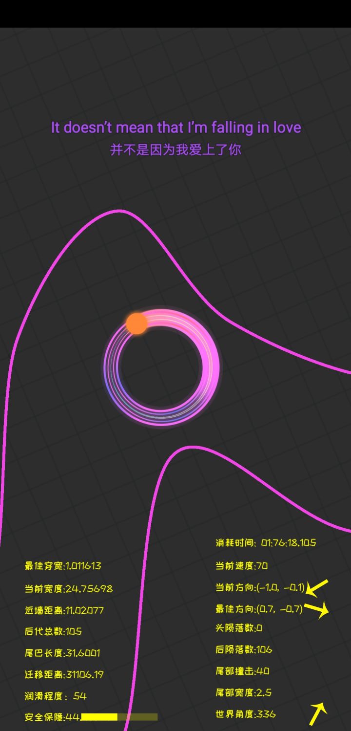 控制方面:“蛇蛇”的控制方式只有点击。“蛇蛇”会自动的向一个方向转圈,当点击后“蛇蛇”会立即改变转圈的方向,由此通过类似真实蛇的前进方式前进。“蛇蛇”后面的小蛇宝宝,在“蛇蛇”撞击后将沿着“蛇蛇”的走过的路径继续前进,当走完这个路径后会找出一个安全方向并直线前进,直到再次受到点击控制才恢复摆动前进。这个安全方向,有时会因为之前“蛇蛇”的处境而决定,走的路越窄,小蛇宝宝的安全方向识别就会越差