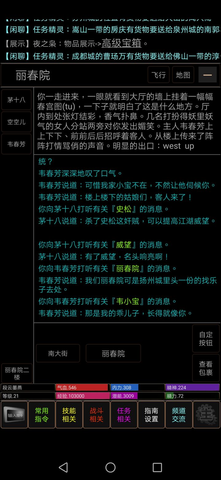 给萌新们的一些常识技巧by 嘟嘟1.点击左下角你的名字,会显示你的健康状态(hp)2.点击下方你的气血条,回血3.点击下方你的内力条,设置加力4.点击下方你的精神条,疗精(要打通任督二脉之后)5.点击指南设置--人物设置里可以设置自动吸气,设置发呆不下线,设置适合自己的战斗信息推送方式6.上图,前者是你目前的潜能,后者是你的潜能上限,做任务发现潜能只得一点说明你的潜能溢出了,需要去门