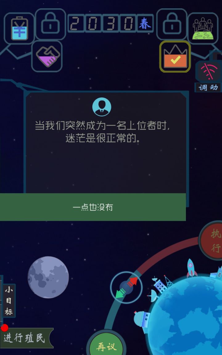 像我这种前期族,一开始基本上不会殖民,疯狂点否定,到很多人认为反正时间会循环回去就不用在意那一刻我就开始,肯定肯定肯定,注意!重大事项那边一定要肯定,那一些数值,不要满格,不要空格,后面倒计时的时候就会有坑,有一个地方如果你点肯定了话,你就马上Ko,倒计时一定要看,如果实在不行,你就通过殖民啃一口c