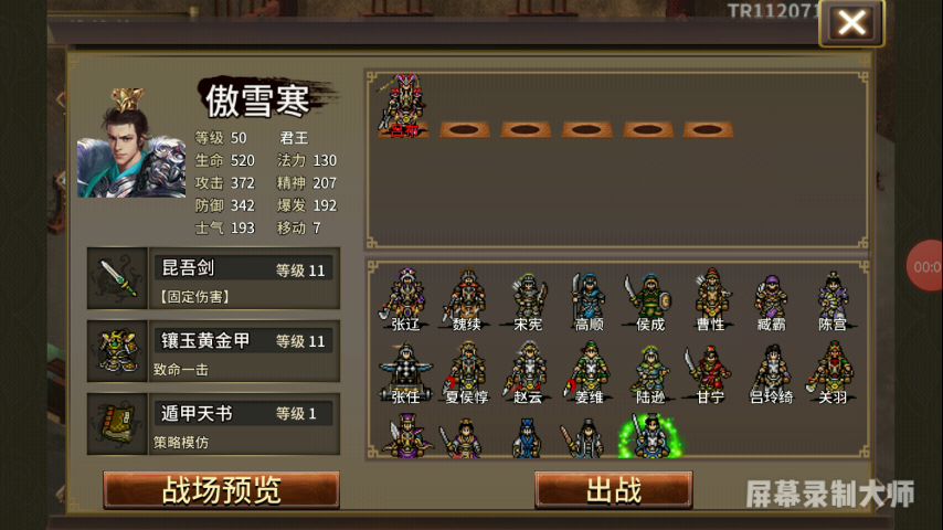 霸线攻略开始前,先了解下我的人物等级。 共线中除突围之战中的特技【严防】跟百鬼夜行中的印绶未获得外,其他道具均获得。 感觉共线写的东西有点多,接下来的攻略就省略部分吧。难度低的关卡,装备及站位就省略不说了。 第二十二关--长安之战贰 1.战力变化: ①第一回合马云禄出现,我军可控 ②第五回合我军阶段,右下角出现伏兵(郭嘉带着4个武术家8个策士)。吕布会直接冲上去阻拦,习得特技【强攻】后砍死乐进李典
