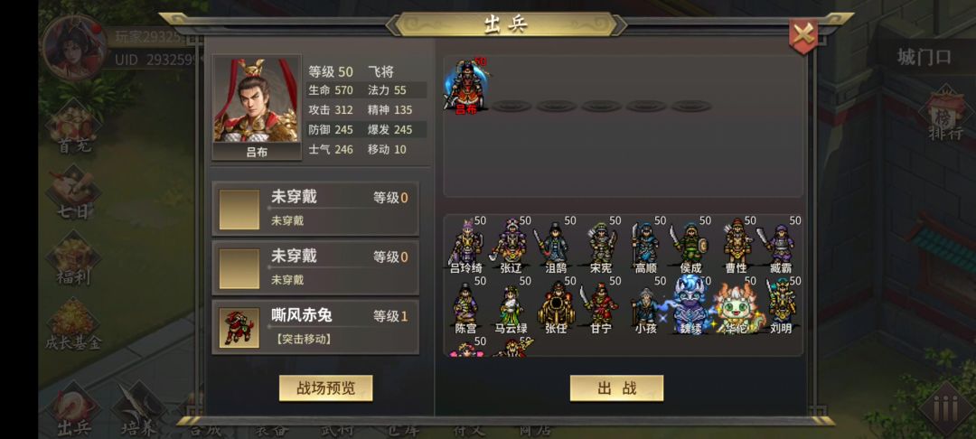 出战装备视频有, 第一步刷开局,刷董平。 下面是具体角色要求—— ①一号位吕布。固定出战位,无装备要求。 视频带的是老无尽50层送的辅助装备,效果是降低敌军6%防御,这个装备给奶妈或者貂蝉带都行。 ②宋小宝,长弓箭手。带的武器效果是攻击扣百分之十血量,辅助装备击退敌人,两个要求。 ③自定义刘明。戴的套装,3件套装效果是给周围己方加7%全属性,衣服效果是周围降低敌军8%属性。需要赤兔马特技,我的皮肤