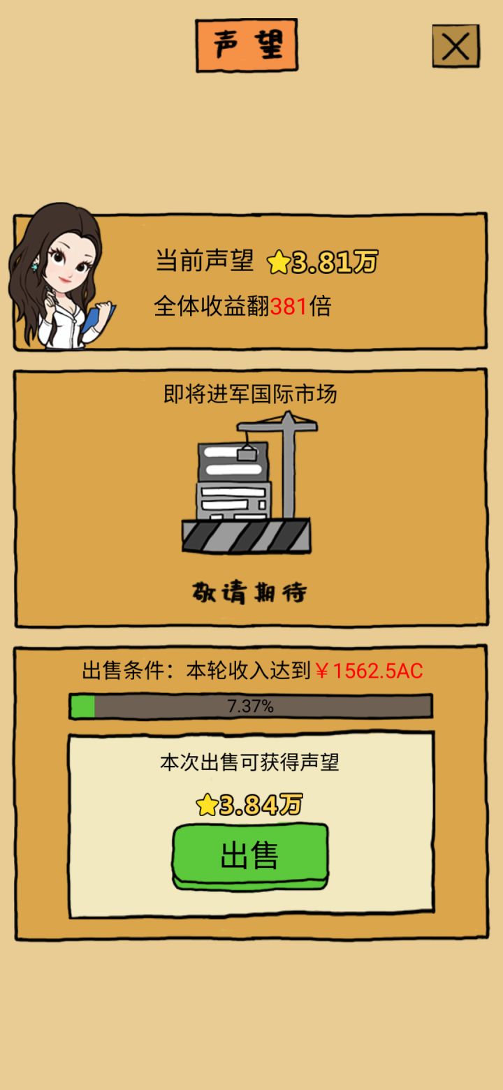 一点个人小建议(不一定正确):打算玩的话,先把各种行业升到速度最快(大约在125-150级左右),然后只升最上面就好。因为虽然有“全体行业升到多少级全体收益翻倍”,但其实下面的翻十倍收益不一定赶得上最上面升一级。广告只要看声望选项“保留等级”就行,其它没必要看,因为广告绝大部分都是三十多四十多的超长广告,相当恶心人。