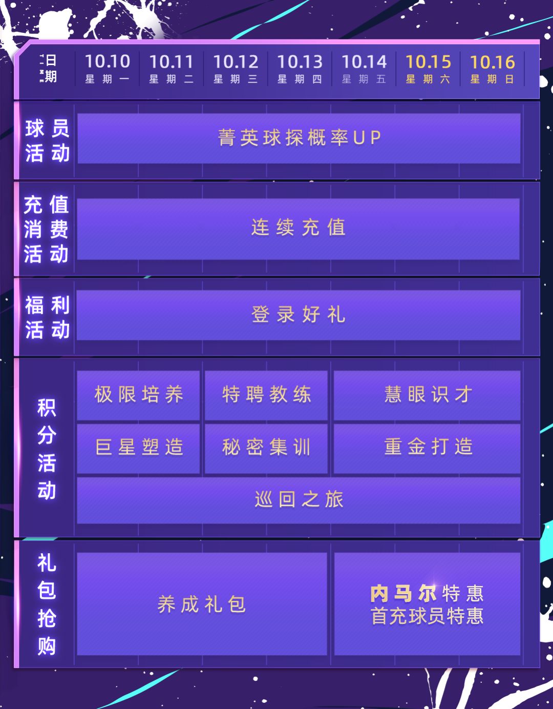 新赛季已经打响! 各大豪门都开启了抢分冲刺,想要为球队再添荣誉成为功勋经理人! 这次的【功勋经理人主题活动】我们为大家准备了10大惊喜活动! P.s.以下截图均为测试截图,具体内容以上线后为准哦! 一、登录好礼 活动时间:9月4日10点-9月11日0点 活动期间,每日完成签到即可免费领取包含机票、试用周卡在内的多种豪华礼品! 二、节日拼图 活动时间:9月4日10点-9月11日0点 移动碎片完成