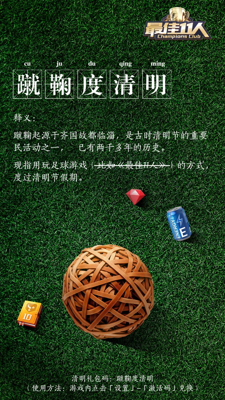 不知不觉小长假已过去一天了除了扫墓、祭祀、插柳、踏青1姐再给大家科普一项传统民俗——可能很多经理人都不知道清明还有这样一项传统民俗吧?蹴鞠是现代足球活动的前身杜甫曾在诗歌《清明》中写到“十年蹴鞠将雏远,万 里 秋千习俗同”代表唐朝蹴鞠活动已经相当普及了~叽里呱啦摆了这么多,其实1姐就是想给你们送点福利热乎乎的假期礼包码呈上蹴鞠度清明 ↑礼包打开可获得 :战术书礼盒*2