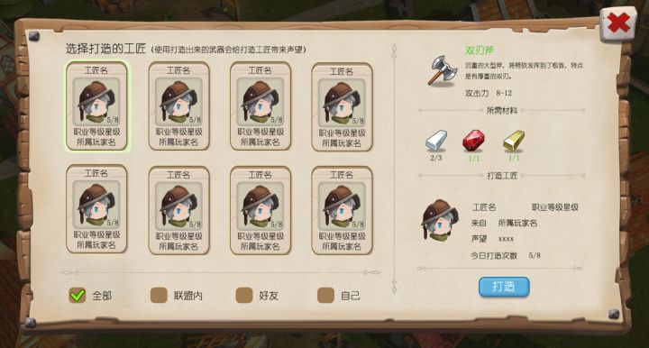 各位旅团长大人,周末愉快!游戏还不能玩,于是在下找了个旧资料给大家先解解馋。选择加工时,玩家可以选择加工的工匠(工匠还划分了各种职业,比如铁匠,裁缝等)。所有可以帮自己加工的工匠,排序顺序按照工匠职称等级、有无加工次数。如果不是自己的工匠,加工除了有素材图纸等要求,还需要给加工方工匠金币作为报酬,价格由装备决定。确定加工后,立刻获得加工结果,会根据装备类别随机出前缀(也就是技能)。对于一