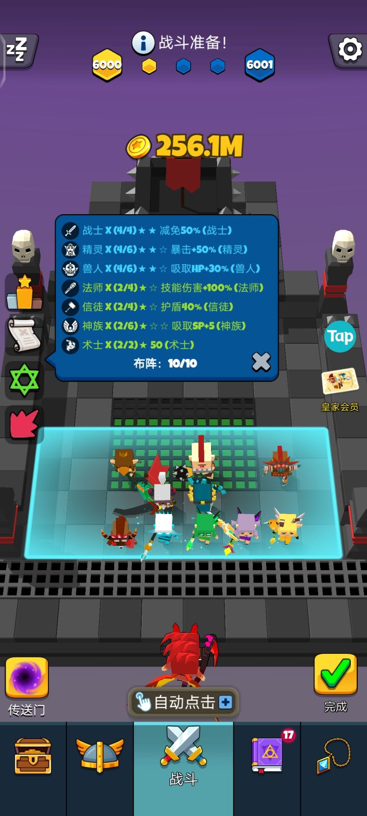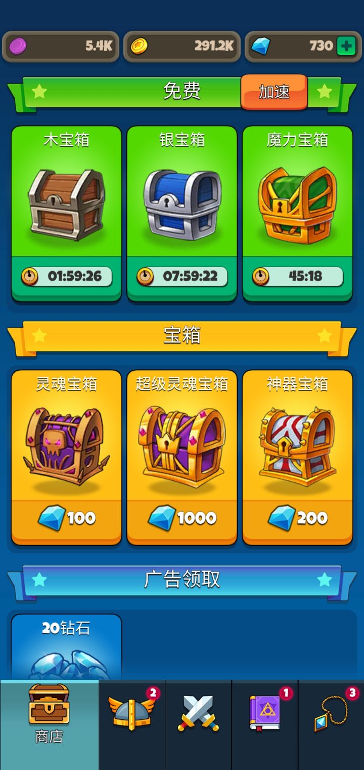 每日广告:宝箱广告10次,钻石广告10次,金币广告5次,自动点击广告5次,老鹰广告5次(看一次宝箱广告,然后切换到战斗界面就会有老鹰宝箱,老鹰宝箱优先开十倍钻石,其次十倍魔力币),离线金币广告6次(离线金币广告至少一小时生效