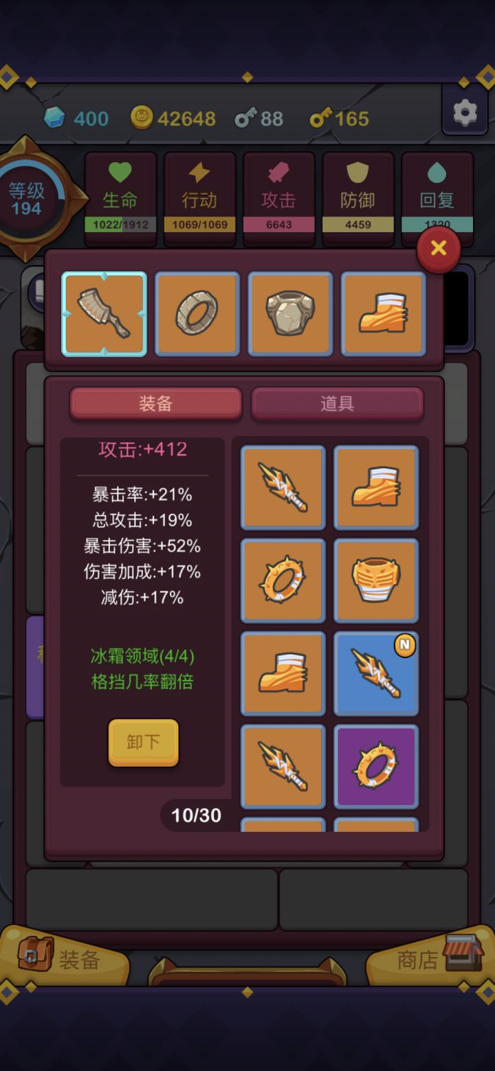 先说下自己的情况,我是从新存档到通关一共花了两天,194级通关,全套的橙色苍穹套,格挡套装属性。其实我进第30关的时候才170级,结果打完BOSS就194了...具体见图,鞋子是运气好主线给的,比起苍穹套就多了一百多防御力...由于这个游戏太好玩了,强大的及时反馈很容易让人上瘾,所以我才肝这么快,应该算是极限通关,所以其实我觉得这个游戏也能玩的很策略,不是一个简单的点点点游戏。在完整通关之前我开