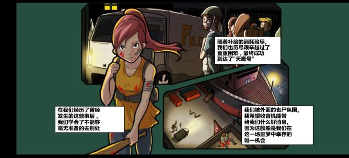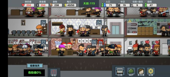 终于通关了。回头看这就很简单了。发个小攻略给没玩过的朋友们。第一开局选武者,加攻击力。前期以招人为主。资源够用就蒙招人。有了人口基数啥都能干。前期任何广播要求增援都不理。等人多了,把最强的从安全屋拿出来。把一批手枪弱鸡放进去。如果为了通关快。资源够用就一直探索不收集。很快就到天鹰号了。侦查探索电力,药房,天鹰号,以及红色危险等级。预备五个最强的放在安全屋。等求救就把这五个放出去。同时屋里还保证满员满安全度。其他没啥。武器多的没处放。黄色图标出货很猛。