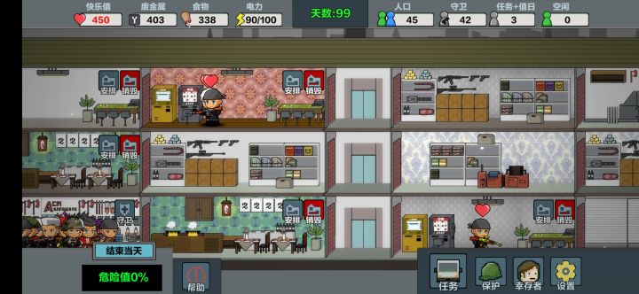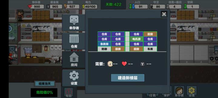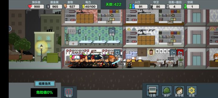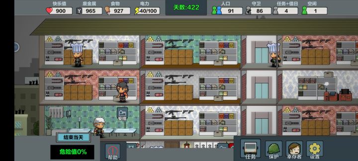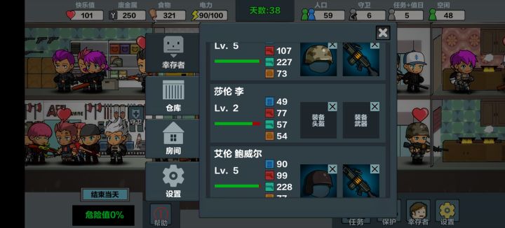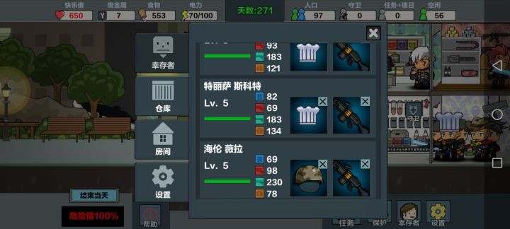 最高人口101,楼层拉满,探索100%,资源全拿,所有任务全解锁,一天完成,前期玩可以用第一个人物,打不过就空防护屋,5个人去外面探索,家里不留人,过100天换第4个人物,优先探索,探索人物拿最好装备,厨房的要工作效率高的,厨师帽,指挥官帽,都给打工的,其次其他人物去防守,前期20完全够,后期50人,再多僵尸也攻不进来,就是内容有点少,好游戏是好游戏,希望快点更新正式版
