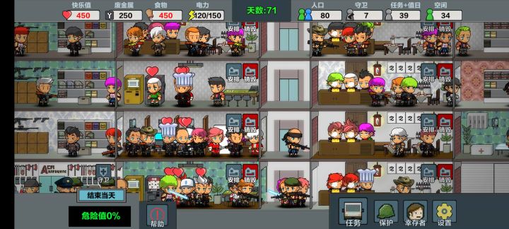 71天通,80人过关。第一次用的武者,玩了15分钟搞懂游戏模式,删档选了武器大师,个人觉得这游戏最重要的是人口。在简单试验下可以得出,在同一间房屋中:人数越多,所获得的物质越多。也就是说在派两人就可以使搜索危险性降为零的情况下,可以再派3杂兵充当搬运工。搜索幸存者同上,队伍满编时,最大可说服3人。侦查不用满编,满足战力要求即可。这样玩保守估计90天搬空整座城。附图一张: