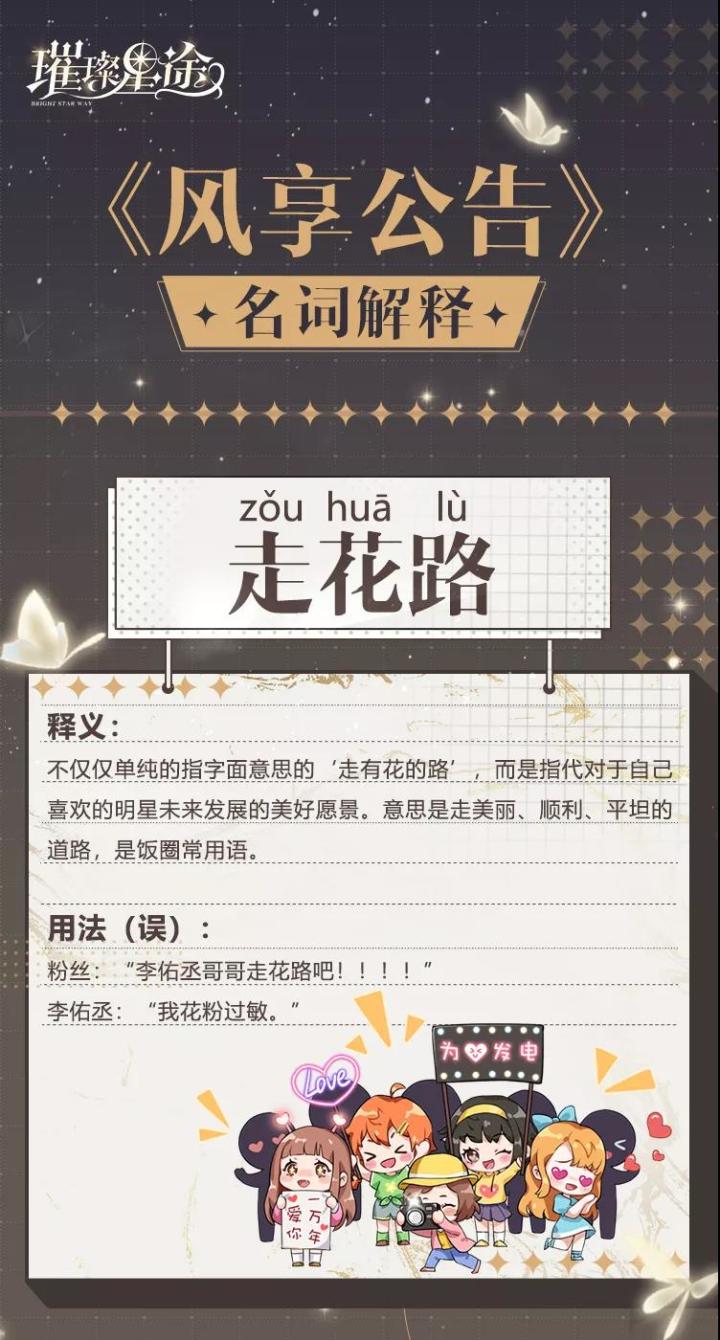 ✦✦✦风享文化公告更新专栏啦~经纪人们快过来听课!“走花路”不仅读起来美,也表示着大家对自己爱豆的美好祝愿呦~李佑丞的回答快要笑死小狮子了,依然是那么的直男~✦✦✦(点击图片即可放大查看)今天的名词解释小知识你学会了吗?经纪人们还想了解哪些娱乐圈名词呢?快来留言告诉小狮子吧~