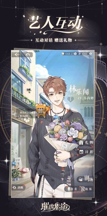 闲下来的时候,去给艺人们探个班吧。带上他/她最喜欢的礼物,来一场轻松愉快的聊天,更加了解彼此。✦ 系统更新 · 探班 ✦与你的艺人对话,正确回答他/她的小问题可提升好感度。送给艺人不同的礼物,收到来自他/她不同的回应。✦随艺人好感度不断提升经纪人可解锁和艺人的更多故事与信息。✦阅读探班日记可消耗体力点为他/她处理片场的各种事项,增加艺人好感。查看艺人的在组日记可查看