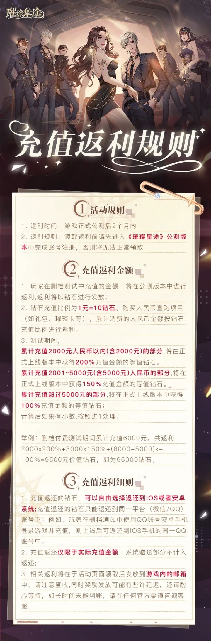 亲爱的经纪人,《璀璨星途》璀璨测试将于7月23日开启!本次测试为限量付费删档测试,经纪人在本次删档测试中充值的金额,将会在公测版本中进行返利,具体返利规则查看下图!如果经纪人对返利规则有任何疑问,可以在本帖内或社区内留言,会有相关工作人员帮助经纪人解答呦!