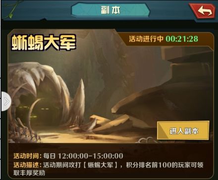 在每天的中午12点-15点,在副本中会刷新出各种等级的小蜥蜴,消耗一点体力进攻并击杀他们,可获得大量的副本积分,等级越高的小蜥蜴,可获得的副本积分越多,副本积分可在副本商店兑换各种道具。进攻小蜥蜴由于副本内的小蜥蜴数量是有限的,所以可能较高级的小蜥蜴会被其他玩家抢夺击杀奖励,所以进攻时最好尽快击杀获得击杀奖励。根据击杀的小蜥蜴等级获得副本积分,在活动结束后,在邮件处或副本积分排行榜内领取副本奖