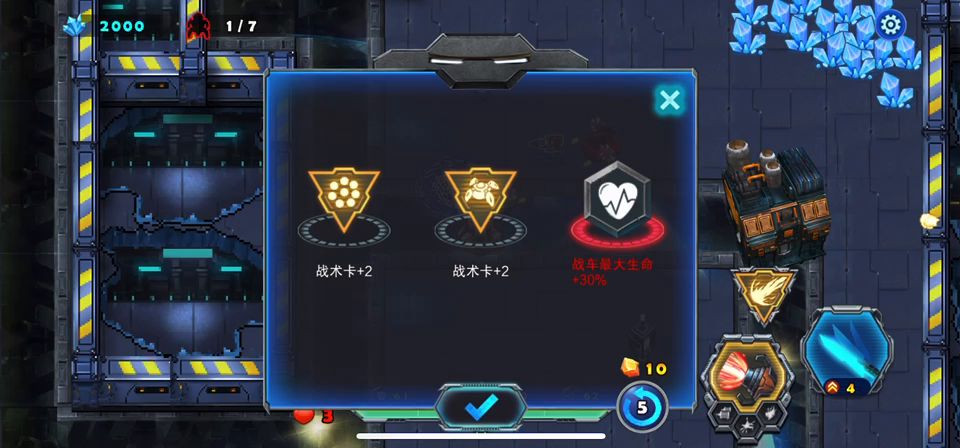 日常任务之一比较难得一个任务,因为这个空中堡垒第二关敌人特别多,用时也挺长的我,稍不留意被敌人打中一次这个任务就完不成了,经过仔细研究终于破解了这道题,打法要点:主战战车不要正面参与战斗,最多就是把辅助战车甩出来打击敌人,主要任务就是安放枪塔和升级枪塔,升级过去前线给枪塔升级,多数时间待在基地周围等待。敌人7轮进攻被击退就通关了,完成任务拿氪石了。