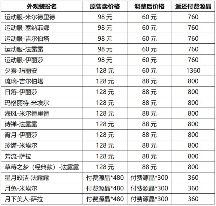 亲爱的冒险者角色的外观装扮一直都是冒险者们重点关注的游戏内容,在听取了各位冒险者的反馈和建议后,我们决定在10月26日的版本更新中,对游戏内的外观装扮的售卖价格进行优化调整,同时对已购买对应外观装扮的冒险者进行差价的双倍付费源晶返还。未来版本新上架的外观装扮的售卖价格也会根据此次的调整进行重新定价,特惠期间购买附赠对应价格免费源晶的福利也会保留。具体调整如下: 返还说明:已购买调整后降价的