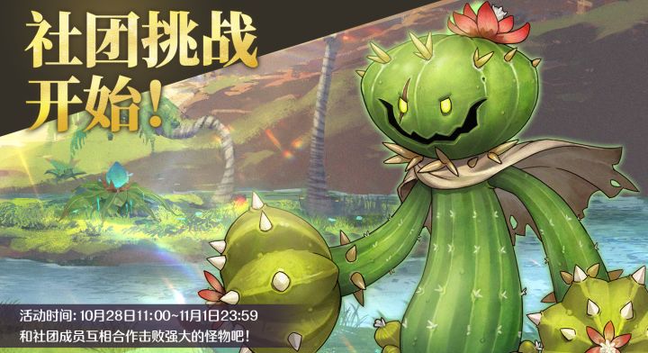 各位亲爱的冒险者:10月28日11:00,「社团战」限时开放挑战!加入社团,一起讨伐BOSS吧!社团战中的BOSS非常强大,需要社团所有成员协力进行讨伐,了解BOSS的战斗特征以及元素克制属性,合理的搭配阵容,可以更轻松的挑战BOSS。每日参加社团战挑战BOSS可获得个人挑战奖励和个人积分奖励,个人积分会累计计算到社团积分中,社团积分达到指定分数,社团内所有成员可获得对应的社团积分奖励。社团
