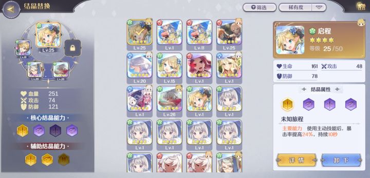 结晶系统是这个游戏十分重要(氪金)的一部分。但是随着主线的推进可以获得十分优秀的核心结晶,并且3星4星也有着不错的属性。这篇攻略主要带大家了解结晶系统的大概,并且如何搭配才能更强。如果有错误欢迎dalao来指正。1. 结晶系统简介每个人物都拥有5个结晶槽,一个为主要结晶槽,另4个为辅助核心槽。主要结晶可以依辅助结晶的颜色来激活技能,而辅助结晶只有在满破的情况下才能动主要技能,满破需要4张对应的