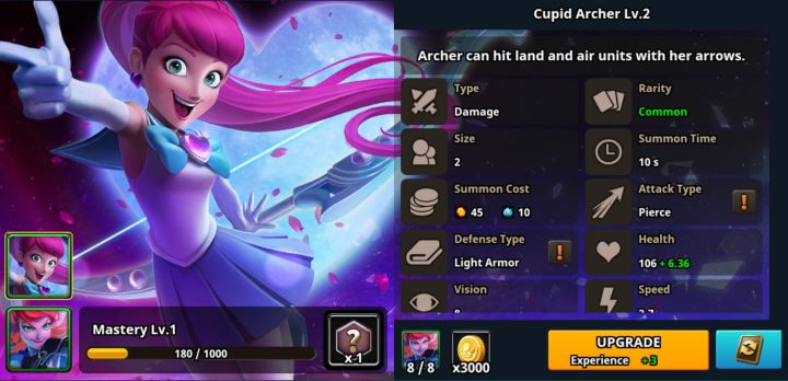 弓箭手王国基础兵种之一,集各种优点为一身。便宜、小巧、召唤时间短、易获得、升级简单、可对空对地以及不俗的攻击力。兵种类型: 进攻型攻击类型: 穿刺攻击: ⭐⭐防御: ⭐血量: ⭐射程: ⭐⭐⭐⭐移速: ⭐⭐皇家狙击手皇家御用部队中的一员,在战争中往往扮演着远程支援的角色。自身拥有主动技能,发动后可增加射程并增加基础攻击的强度。在对局的中后期,适合大量召唤来应对敌方空中和地