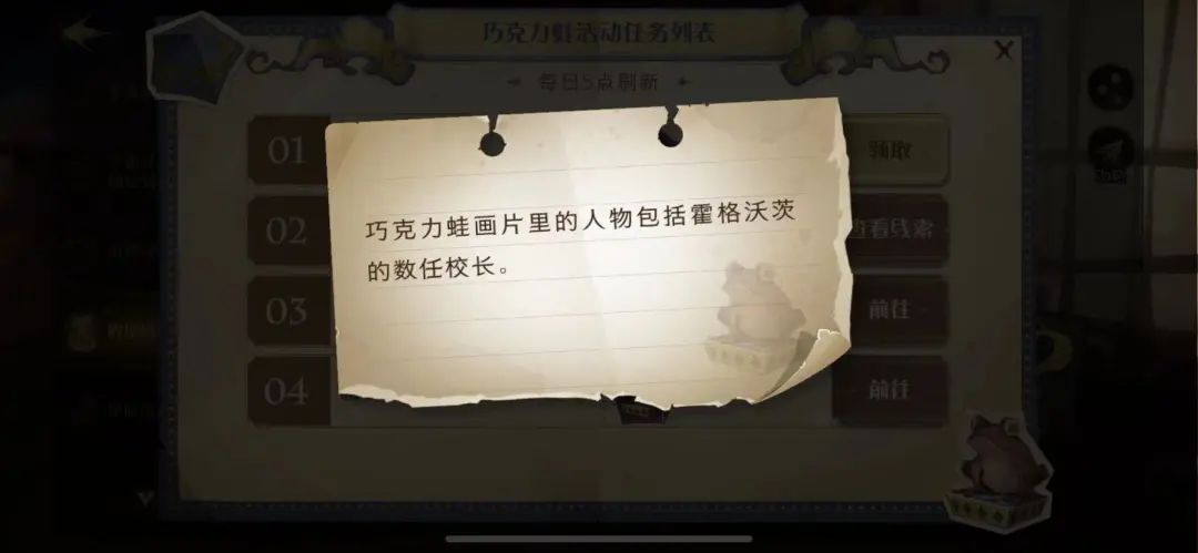 今日巧克力蛙NPC:麦格校长。 “巧克力蛙画片里的人物包括霍格沃兹的数任校长。” 具体地点在校长室门口,从城堡主楼一直往上走找到校长室,与门口的麦格教授对话即可获得。