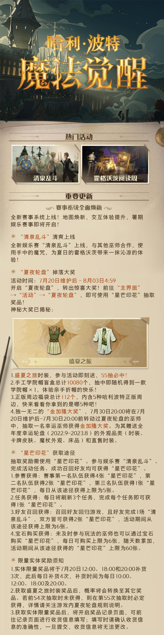 亲爱的巫师们:为了给大家带来更好的游戏体验,服务器将于7月20日(周三)早上07:00-09:00进行停服维护,如未能按时完成,则开服时间将会顺延。本次正式服更新内容请点击图片查看。维护期间将暂时无法进入服务器进行游戏,给各位带来的不便,敬请谅解。感谢各位巫师的支持!