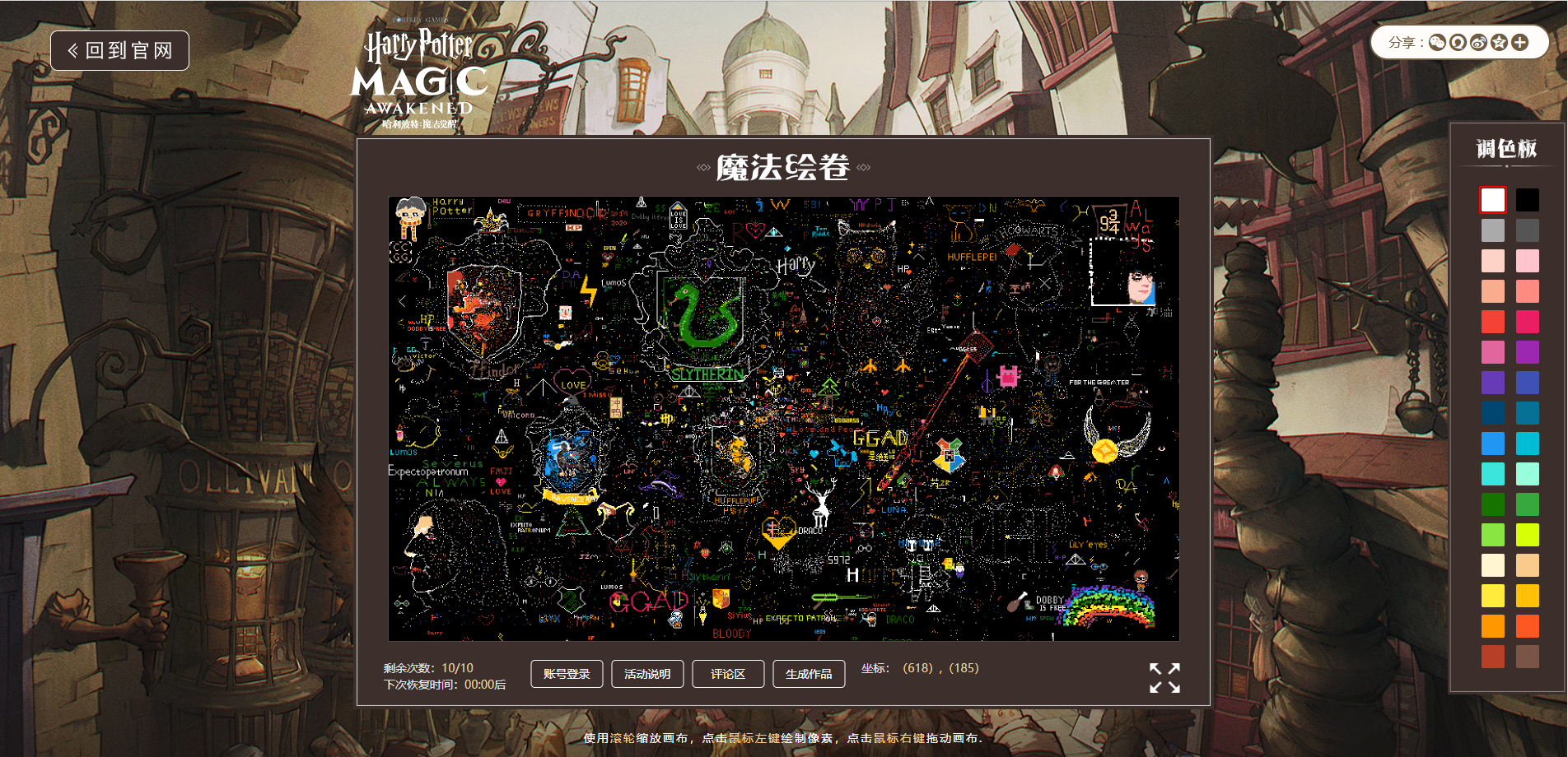 一起见证哈迷们的力量吧!魔法绘卷已经准备完毕,请发挥你们的想象,在绘卷上携手描绘心中的 #魔法觉醒时刻#,赢取专属奖励 !绘卷入口:PC端:移动端:(PC端绘制体验更佳)活动时间:12月5日-12月19日绘制规则:1. 玩家可通过PC端或移动端进入魔法绘卷,与同伴们一起绘制图案,每个像素点都为公用,皆可施咒上色。2. 所绘内容可以是魔法物件、巫师形象、神奇动物、学院图腾、魔法世界