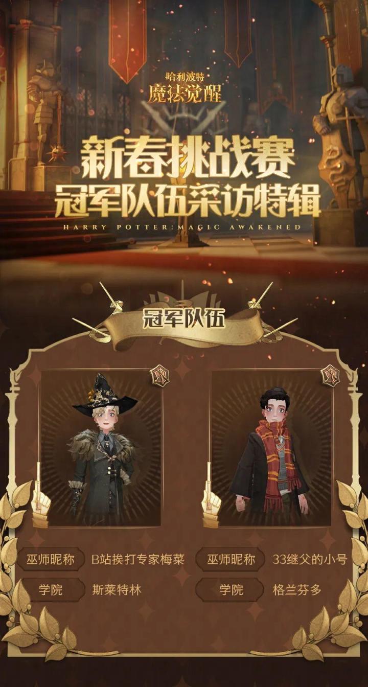 ✦新春挑战赛·三强队伍采访特辑✦首届新春挑战赛落下帷幕巫师的决斗演绎精彩纷呈! 信任——或是初次邂逅,或是早已相识决斗场风云莫测而他们可以放心地将后背交给对方勇气——各路选手皆是劲敌他们临阵不惧即便暂时失算,也将迅速调整迎接下次进攻实力——超凡的游戏理解队友的默契配合方能在众多挑战中过关斩将三种要素,铸就了本场比赛中三组“最佳拍档”! 接下来,有请冠/亚/季军队伍