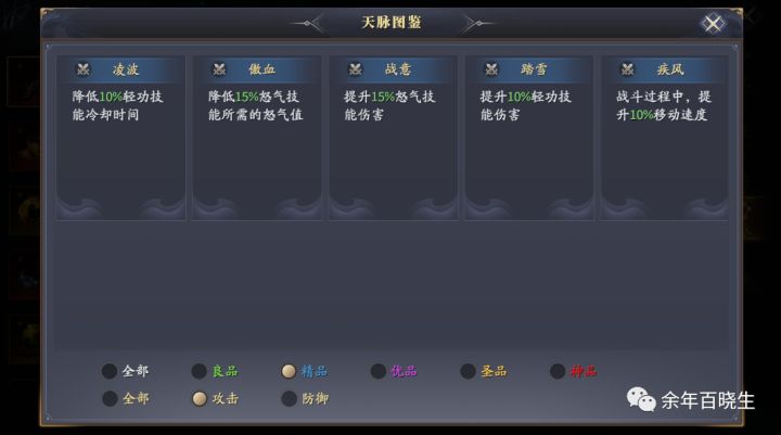 各位庆余年手游的玩家,玩了这么久各位的天脉都洗出什么套装了,今天我们就来介绍介绍一些常用的天脉和图纸的活动方式。天脉分为攻击天脉和防御天脉,根据装备部位来区分,攻击类装备有镯、戒、链、佩、符,武器。防御类装备有冠、衫、腕、衿、履、绔。 我们先来分析分析天脉的套装效果(绿色的就不介绍了,相信大部分玩家都洗到蓝色以上的天脉了)。 击类天脉蓝色攻击天脉凌波:降低10%轻功技能冷却时间傲血:降低15