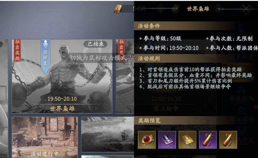 大家好,我是来自庆余年手游攻略团的小编-白菜,今天给大家讲解一下【世界枭雄】的玩法。 因为考虑到虽然已经开区快2个月了,好像还有很多人不知道枭雄怎么玩,这边简单的讲下机制玩法。(因为枭雄可以说是目前收益最高的一个帮派活动了) ①从奖励而言最重要的是公孙鸿,然后是雄霸天,因为只有这2个产出金色技能书和天山 ②5%机制特别重要在大多数区里,因为说实话现在每个区活跃的帮不是那么多,所以只要你摸5%的伤害奖励都不会低(因为拍卖奖励的底线是这个boss你帮派的输出得超过5%才有奖励) ③我大概讲下我们帮的打法(目前我们帮80人左右,第二帮50人左右,第三帮60人左右,第四帮20人左右。其中榜前三在第二帮,我们跟第三帮友帮,第二和第四友帮) 首先我们帮2个大团分兵公孙鸿9点、12点,派出2个小队(都是高战)去雄霸天的2个点摸5%,再安排一两个人去摸小怪的首刀5%。如果2帮进攻我们的哪个点,留下1个队伍守点,其他人集中支援被攻打的点,清完人立刻恢复到开始的布局位置,防止他们虚晃一枪。如果他们放弃公孙去打雄霸天,则不去支援,先把公孙打完,让他们最起码公孙的5%打不到(当然从利益角度其实打到55%就可以停手,但是我们的目的是为了让第二帮拿不到奖励,所以得打死,再去雄霸天支援)然后雄霸天安排了10个人必须是高战,这样能确保最起码5%的伤害他们是能摸到的,如果实力不行,可以安排双剑远程输出偷5%。指挥要做的事就是不停的跑,发坐标,公孙鸿打的差不多,我马上去阿里木看点,发坐标,等帮里人来阿里木了,立刻退出去慕容雪,以此类推,主要是摸5%伤害 切记!开局不要考虑后面的小boss,重心全放在公孙鸿和雄霸天,其他boss奖励真的没多大用,这2个boss无论如何摸5%,那你奖励绝对不会差到哪儿去,哪怕总体的伤害不高 以上就是九处密探-白菜 为大家带来的【世界枭雄】攻略,祝大家顺利闯荡江湖! 庆余年手游,一个有故事的江湖。 本文由【庆余年手游攻略团】提供。 攻略团长期招募九处密探,天脉者可以发布攻略作品到官方邮箱2240472512@qq.com,并留下联系QQ,有机会被小九(QQ号2240472512,谨防诈骗)邀请加入密探小群哦!攻略团福利多多