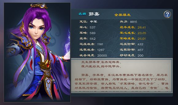 在《》中,相信最能让玩家着迷的就是强力武将的收集了。在《三国很忙》的众多武将中,分为多个层级,最为厉害的,当然便是神将了。每位武将都有着自己的资质空间,成长度越高的武将发展潜力也是越大。今天给大家盘点一下《三国很忙》中的五位大腿级武将,这五员大将,得一便可安定天下。TOP5:料敌先机——郭嘉大腿指数:★★★★郭嘉作为的重要谋士之一,在官渡之战中起着重要的作用。在郭嘉死后,还有着遗迹定辽东的壮