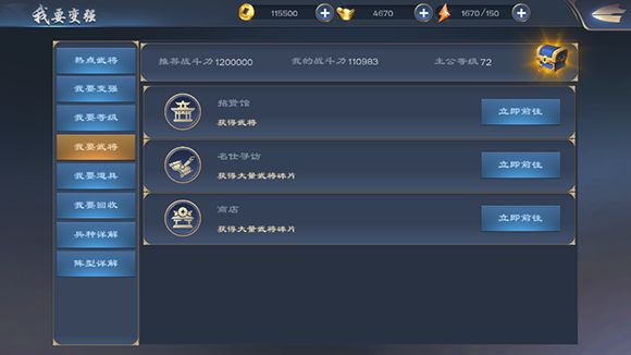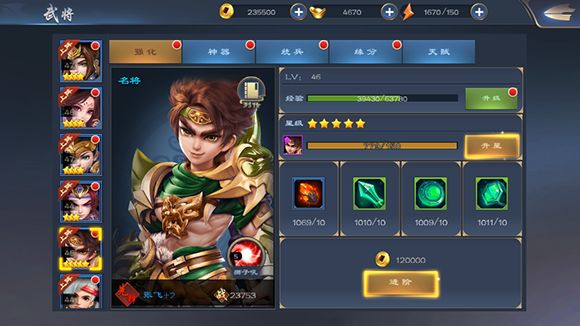 在三国很忙中,武将提升是提升战力的一个重要方式,接下来为大家介绍武将升级和道具来源,以及装备的强化、神器、统兵等功能吧。(以下以曹仁英雄为例)强化装备强化中武将升级经验可通过主线战斗、挑战副本等模式获取,也可通过消耗经验物品升级。升星武将的方式有:1.寻访名将,可以抽取名将碎片用于升级;2.在招贤馆内通过招募获得;3.在贡献商店中购买。进阶需要精铁、短剑、盾牌和吊坠四种,进阶材料是通过完