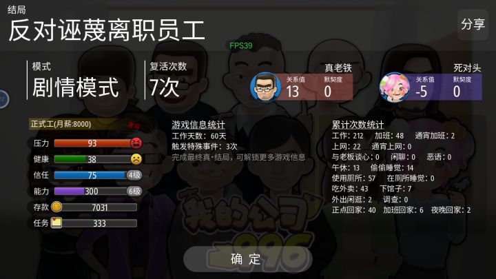 剧情保护的好处大家都体会到了吗 我一开始的健康和存款都快了 都已经没的时候剧情保护把我救了回来后来我发了工资 存款有了7000 我都时不时地下馆子 这款游戏我觉得挺好的 很人性化 最大程度上还原了社会的险峻 就比如说我帮了孟郁说话我就被辞退了 自此游戏结束